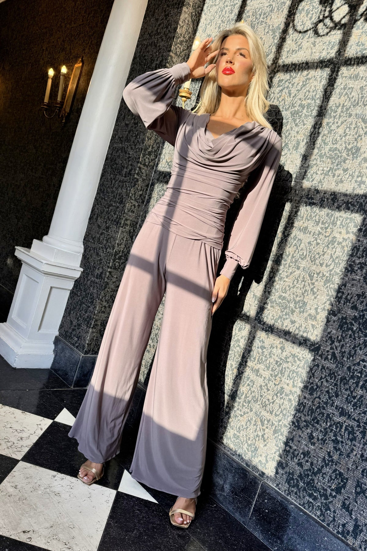 SS26 Indium jumpsuit with bell sleeve in grey taupe